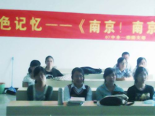 5月25日,07中本一班在财神捕鱼 207室举行了以“红色记忆——南京!南京!”为主题的团日活动。此次团日活动采取集体观看影片《南京!南京!》的形式,缅怀“南京大屠杀” 这段中华民族的血泪史。