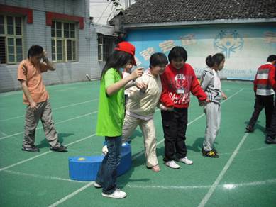 当志愿者穿着绿色的志愿服、带着鲜红的志愿者帽出现在孩子们的面前时,他们欢欣鼓舞,手舞足蹈,亲切地和志愿者们问好。虽然有些孩子由于先天的原因,无法正常准确地用语言来表达他们对志愿者们到来的欢迎,但是从他们灿烂的笑脸上,亲切的举止中,志愿者们依旧可以体会出他们的热忱,感受到幸福的味道。