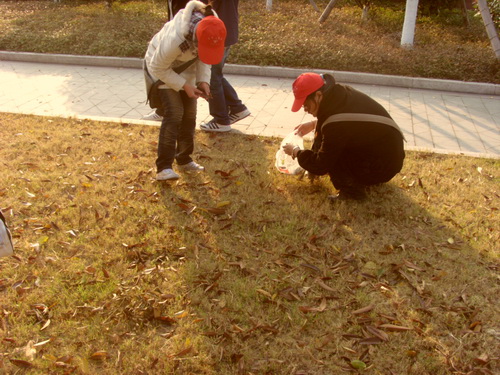 下午3:20,志愿者们从北校出发。首先来到了学子广场。寒风将树叶吹得到处都是。志愿者们便一起将凌乱在道路上的落叶清理到路的两边,围成几堆,还校园一个清洁的面貌。同时将其中各种完整的树叶拾起,为本周三同瓯江财神捕鱼