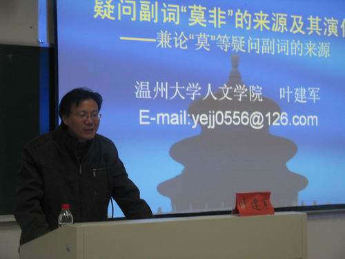 本次讲座,叶建军博士为我们深入讲解了疑问副词“莫非”的来源以及其演变,并兼论了“莫”等疑问副词的来源。讲座内容丰富,在增加了我们对“莫非”一词认识的同时也增加了我们对词语研究方法的认识,让我们对中国文字的悠久历史有了深刻的了解,激发了我们对文字学习的浓厚兴趣。