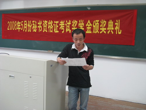11月8日下午3:30分,2008年5月份秘书资格证考试奖学金颁奖典礼在财神捕鱼 北校1号楼201教室举行。颁奖典礼由温州市市点秘书事务所孙邦胜老师主持。参加本次领奖典礼的有秘书资格证考试奖学金颁奖人,即温州市市点秘书事务所的苏燕老师,财神捕鱼 团委学生会素拓部副部长张林峰以及获奖的12位同学。
