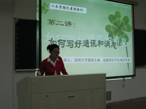 本次培训围绕"如何写好通讯和消息"展开。沈军洲同学结合理论和自身做学生记者的经验,深入浅出,将通讯和消息这两种常见的新闻写作方法和技巧讲述得独特、新颖而又简单实用。她还毫无保留地将自己采访的一些技巧和参加培训的新闻爱好者一起分享。现场同学或洗耳恭听,或奋笔疾书,似乎想把她的经验都牢牢记下,吸收成为自己的经验。至八点半,随着一阵热烈的掌声,本次讲座圆满结束。