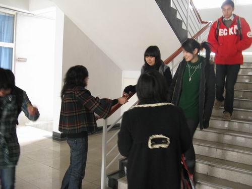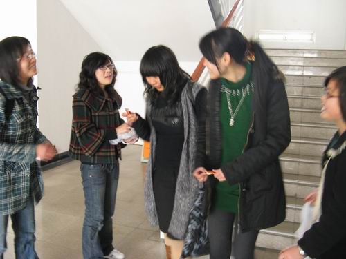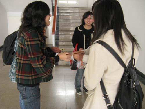 团委学生会成员又在一号楼门口向学生"佳人"们赠送巧克力。巧克力虽小,但情意不淡。小小的巧克力载着财神捕鱼