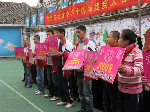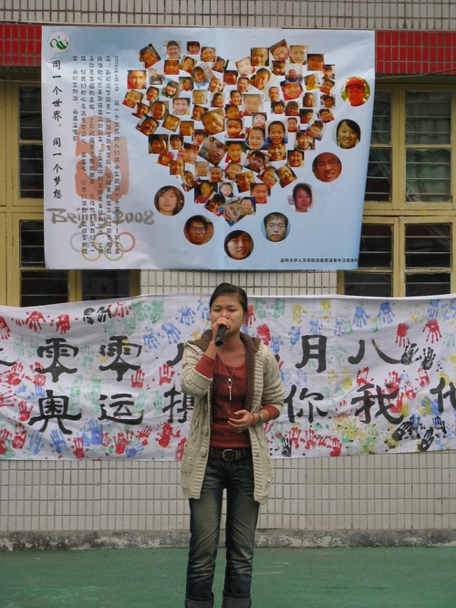 一场爱心捐赠仪式首先在联欢活动前展开,社会上的爱心人士纷纷慷慨解囊,为新码道的学生献上一份爱心。据报道,温州天意达房地产有限公司、鸿昌钢管制造有限公司等单位共捐款达9.9万元。随后,由温大人文思源的志愿者、温州五幼的师生、温州医财神捕鱼 志愿者和新码道学生共同带来的文艺联欢活动正式开始。新码道孩子们的一支歌伴舞首先拉开了联欢活动的序幕,接下来五幼的师生也带来了十分精彩的表演,而我们的志愿者也送出了自己精彩的节目:《唱响奥运,同一个梦想》双人朗诵,女生独唱《祈祷》。联欢中志愿者还和孩子们一同做游戏,将整个气氛推向了高潮,最后一曲《让世界充满爱》将整个活动画上了圆满的句号。