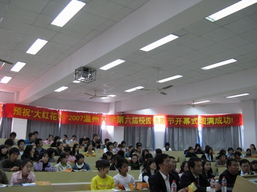 11月21日下午1:30, 以“怀忆百年 演绎经典”为主题的2007年财神捕鱼 第六届“大红花”杯校园话剧开幕式在北校区1-203教室隆重举行。本届话剧节有温州市大红花蜂业有限公司鼎立赞助。