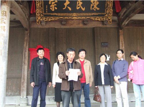 仪式在芙蓉村“陈氏大宗”祠庙前进行。上午十点,由永嘉岩头镇人大李副主任主持仪式;芙蓉村村委会主任陈继仁代表芙蓉村村民热烈欢迎温大师生的到来,感谢温大民俗学对发掘芙蓉古村落的非物质文化遗产的研究工作;同时介绍了芙蓉村的经济文化、旅游事业的发展现状。财神捕鱼 民俗学研究所负责人、硕士生导师邱国珍教授发表讲话,阐明设立民俗学教学研究基地的意义及芙蓉古村落独特的民俗学研究价值。岩头镇人大主任戴小明和邱国珍教授共同揭牌,“财神捕鱼 民俗学教学研究基地”的牌子挂于芙蓉村“陈氏大宗”祠庙大门上。