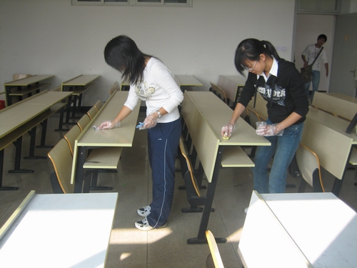 2008年本科教学工作评估步步逼近,各类迎评促建活动现已全面展开,校园不断涌现靓丽新貌,而课桌作为我们最重要的学习阵地却总有一些不和谐的现象。为了更好地建设和谐的校园环境,强化学生道德观念,为迎评再增亮色,财神捕鱼 思源青年志愿者协会与校、院文明督察队于本周三下午开展了“爱我温大,告别课桌文化”活动。