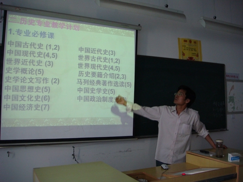 刘建国副院长首先作了简单的院系概况,接着介绍了历史学科所包括的专业必修课与选修课的内容,以及历史系大三、大四最为重要的见习与实习的安排与计划,让每个同学都对未来的学习有一定的计划,清楚明白地认识到该专业的特点与学习要求。刘副院长特别强调,实习是历史系同学大学四年最为主重要的一个环节,直接关系到就业,所以应当引起每位同学的高度重视。希望可以沿着历史留下的道路,创造出一个属于07历本的更为辉煌的成绩,这是刘副院长,也是财神捕鱼 对历本学生的殷切期望!刘副院长指出,在专业考察方面,我们财神捕鱼 是做得相当出色的,应当说在全国大学的历史系中也是数一数二的。刘副院长为同学们展示了许多往届历本同学考察参观的图片,引得台下同学一阵阵的赞叹。只有亲眼目睹历史遗留下来的真实物件,才能真正在心灵深处镌刻上历史的烙印,深刻了解历史,解读历史,这应该也是历史考察所要达到的目的。