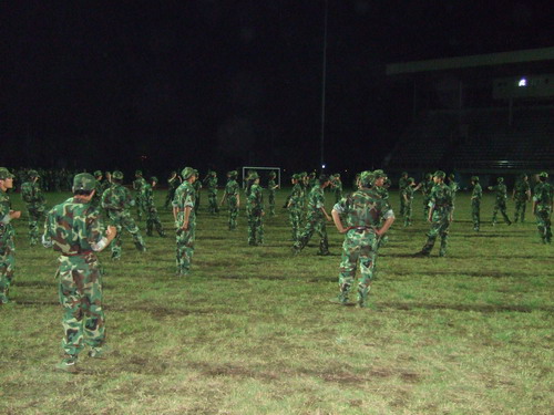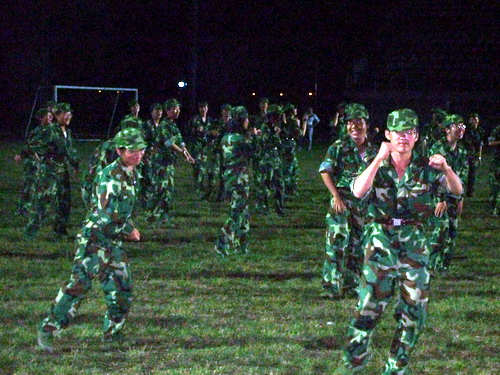 南校区操场上,开始他们的训练。白炽灯耀眼的灯光打在他们身上,操场上出现了一个个英姿飒爽的影子。黑暗中弥漫起青春的执意,教官轻松幽默的训练方式,让他们忘却前一秒的暗光,脑海中浮现出亮得发锃的“坚持到底”四个字,强大的集体荣誉感激励着他们认真地作好每一个动作。
