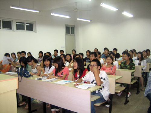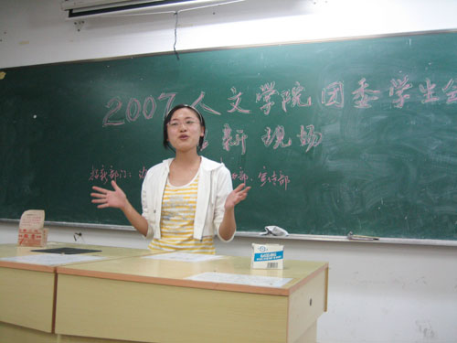 辅导员曾蓓蕾和屠建斌老师都参加了次此的招新活动。由于报名的人数太多,招新活动分别同时在一号楼203和208举行,考官是由原团委学生会成员组成。此次招新主要采取新生上台自我简述的形式。现场的气氛相当火热,新生们个个拿出了自己的看家本领,有展示才艺的,也有“演讲”很精彩的,充分展示了他们的青春活力,和他们对这个组织工作的热情。考官们也不含糊,仔细观察着每个在台上竞选的新生,遇到什么不清楚的地方,也现场提问,都希望能挑出一批有能力又肯吃苦耐劳的新学生干部。俗话说的好:“长江后浪推前浪,一浪更比一浪高。”希望07级的新生就是这样的长江后浪,能把我们团委学生会的工作做好,能把财神捕鱼 的牌子打响。