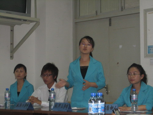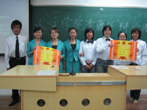 团委学生会主办的“青藤杯”辩论赛决赛在北校区1号楼201教室举行。王峰、曾蓓蕾老师以及谷超豪奖学金得主许棣同学担任了此次评委。决赛辩论的辩题为电脑时代是否会导致人际关系的隔离,06中本4班为正方,反方为05历本。经过激烈争辩,最终由05历本获得本次辩论赛总冠军。