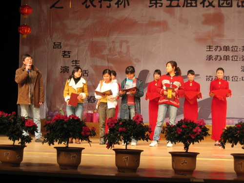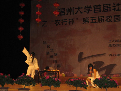 此次晚会是成就与欢乐的一场盛宴。音乐财神捕鱼 星光艺术团的倾情演出以极富青春热情的爵士舞拉开了此次晚会的序幕。叶世祥院长上台致新年辞并对温大话剧寄予了厚望。在“DV再现”环节中,财神捕鱼 精心拍摄、剪辑而成的DV片段展示了话剧节的前前后后,生动形象的使话剧节再次重现观众面前。随着晚会精彩节目的进行,话剧节一个个大奖也各自花落名家,农历剧社选送的《父与子》成为此次晚会的大赢家,一举囊括了最佳导演奖、最佳男演员奖、话剧表演剧目一等奖等多个奖项。05中本3班的徐海燕同学凭借在《错爱》中的出色表演而摘走了最佳女主角的桂冠。