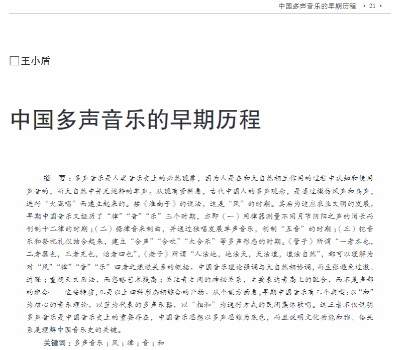 本文通过对多声音乐早期历程的研究,不仅清晰地描写了中国音乐的史前史,而且对先秦乐学的特质及其理论作出重新解释。比如,认为中国音乐理论特质的形成,乃由于四个阶段音乐形态的相互作用。这特质有三个表现:一是强调与大自然相协调,而主张避免过激、过强;二是重视天文历法,而忽略艺术提高;三是关注音之间的神秘关系,主要表达音高的配合,而不是声部的配合。又如认为早期中国音乐有三个典型:一是以“和”为核心的音乐理论,二是以笙为代表的多声乐器,三是以“相和”为常见方式的民间集体歌唱。这三者的产生与发展证明:多声音乐是中国音乐史上的重要存在;中国音乐思想以多声思维为底色;应该从文化功能角度和雅、俗关系相互转变的角度,来理解中国音乐史的发展。