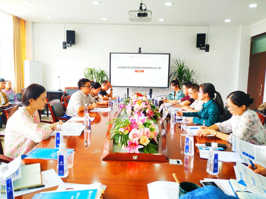 9月23日上午,财神捕鱼 于人文楼213会议室召开了财神捕鱼 2021年“挑战杯”大学生课外学术科技作品竞赛推进会,校团委副书记易招娣、院党委副书记魏一、学工办辅导员胡震鹏、参赛指导老师和学生代表出席此次会议。