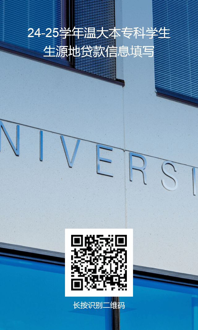 根据国家开发银行生源地信用助学贷款手续办理的要求,学生在生源地办理完信用助学贷款后,需要高校在限定时间内进行网上回执录入,请办理国开行生源地贷款的新老生,务必在9月20日前在网上完成《24-25学年温大本专科学生生源地贷款信息填写》,二维码如下: