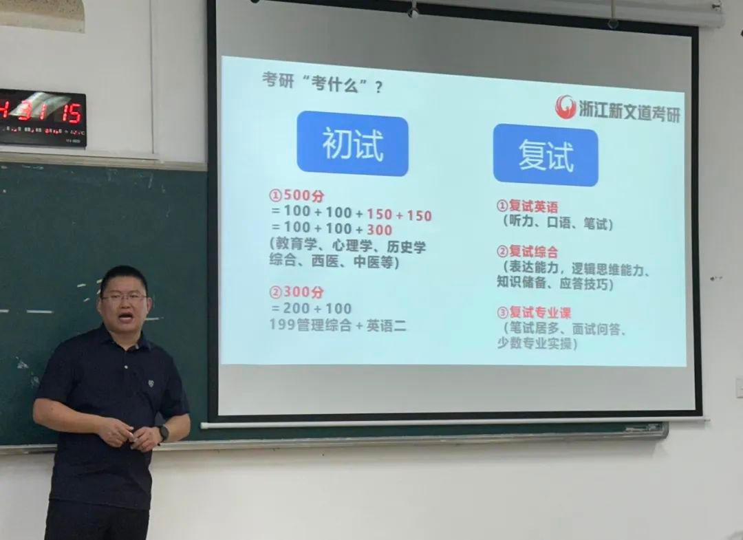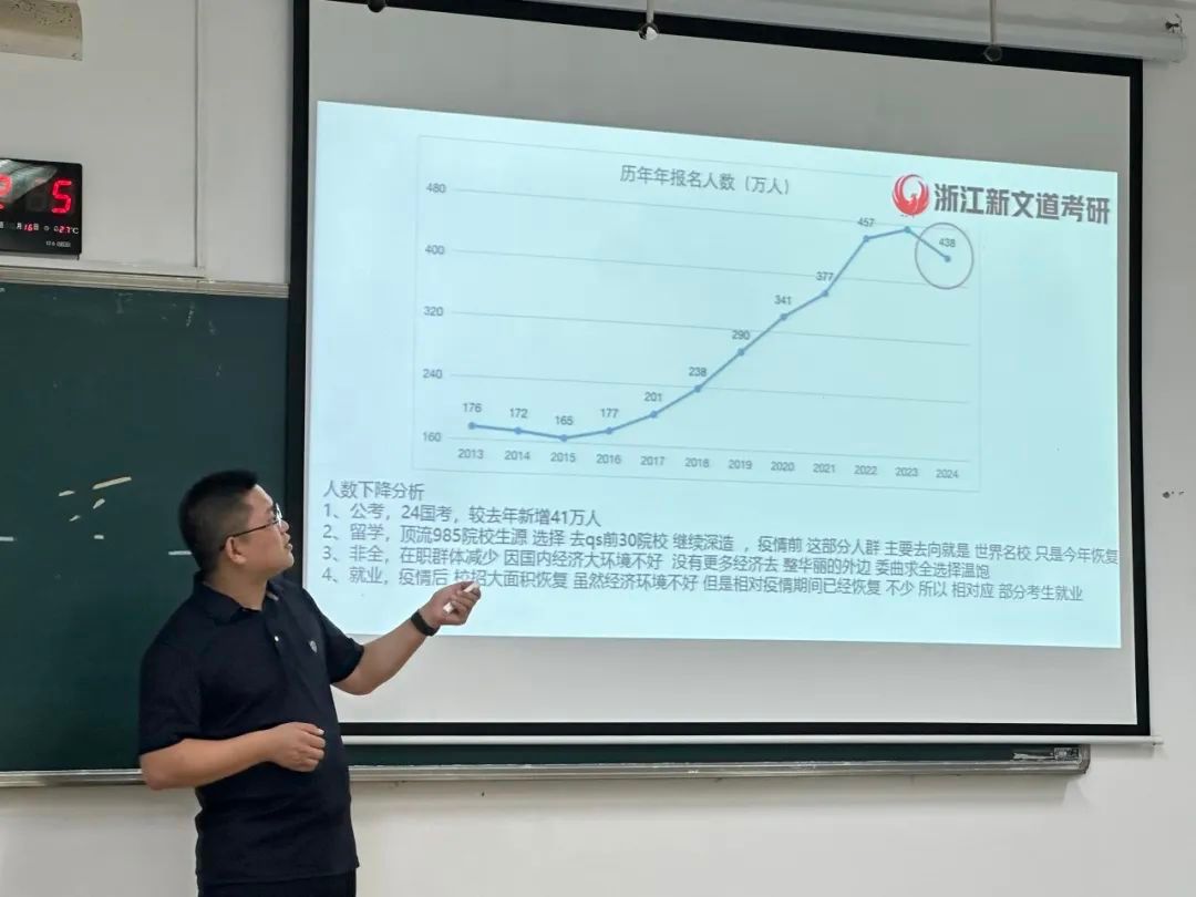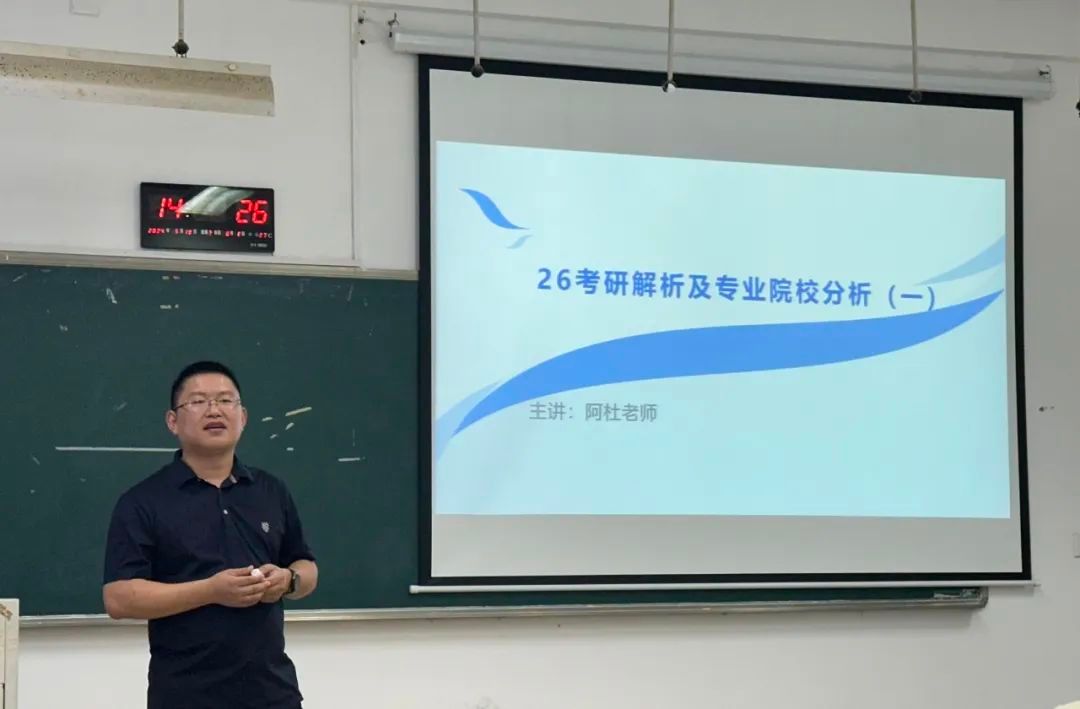 为了帮助同学们在考研准备过程中能合理规划自己的学习时间,提高自己的备战效率,更快找准自己复习的方向,财神捕鱼 于2024年9月18日下午2:00在财神捕鱼 201教室召开了26届考研全程备考规划公益讲座。本次讲座邀请到了新文道考研全程规划名师、考研院校专业选择专家杜老师,为同学们答疑解惑,详细分析考研情况,帮助同学们合理规划备考复习计划。