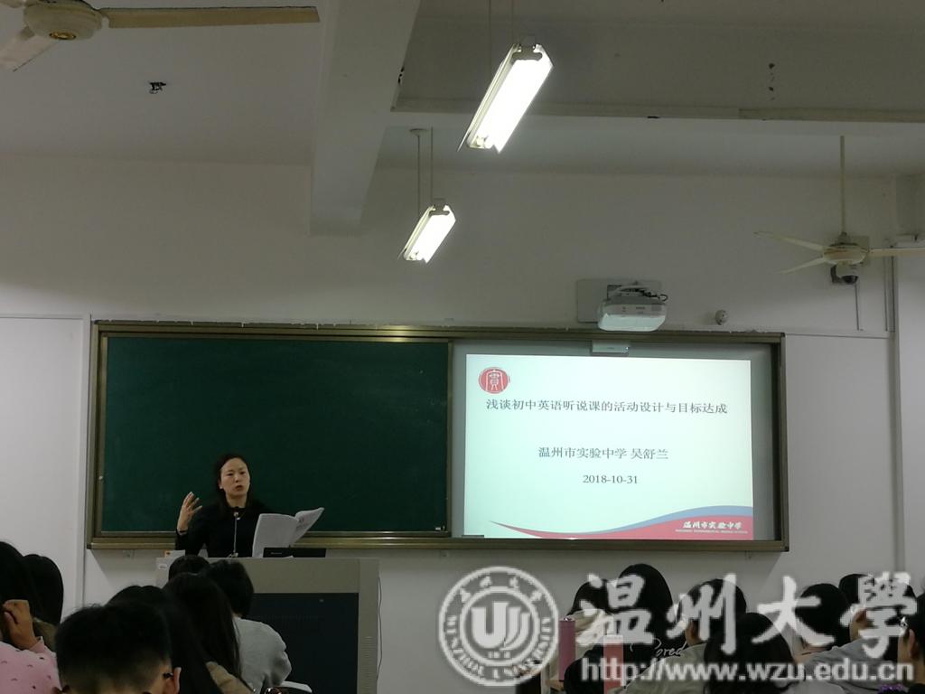 10月31日下午两点,外语楼210教室,财神捕鱼 邀请温州实验中学的名师吴舒兰为财神捕鱼 16英语师范班举行“浅谈初中英语听说课的活动设计与目标达成”的讲座。吴舒兰老师,曾获浙江省优质课一等奖等多项荣誉。