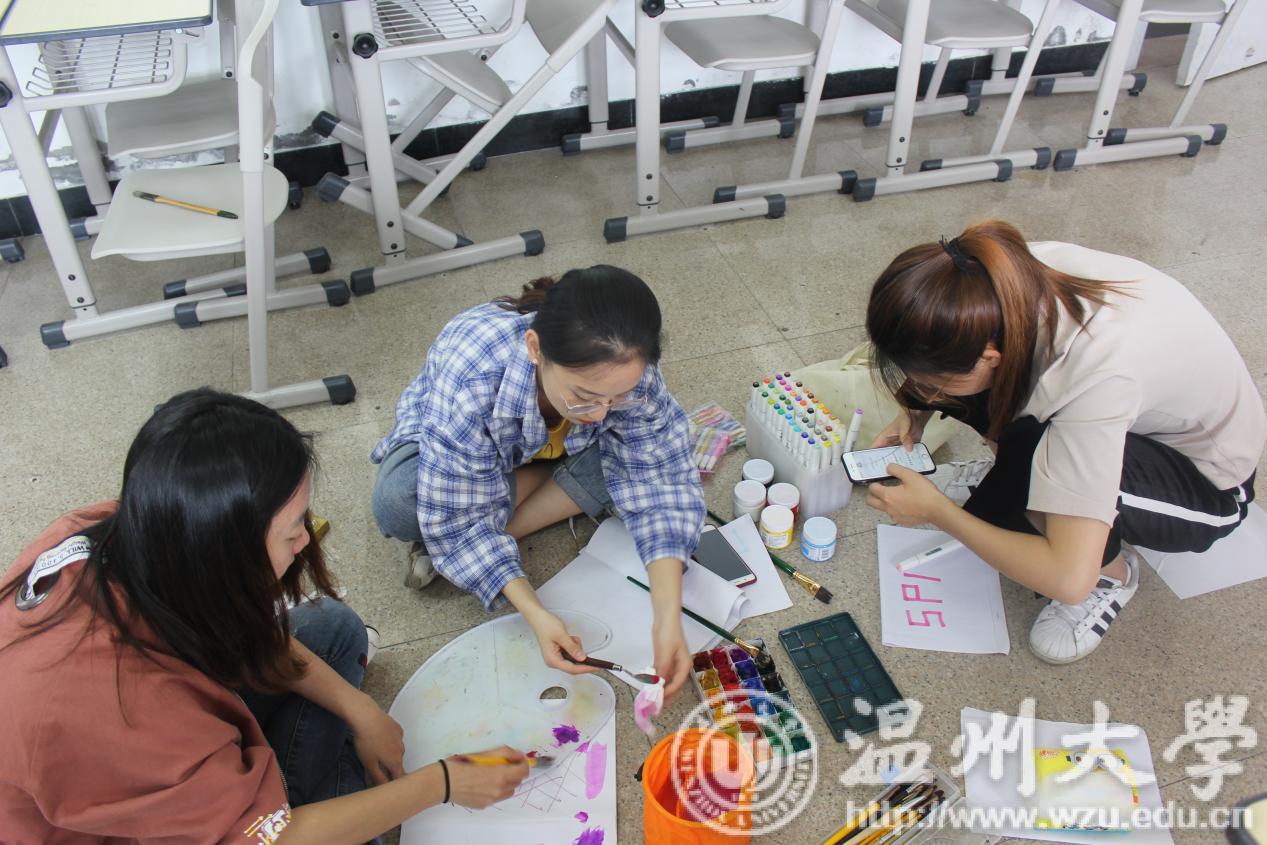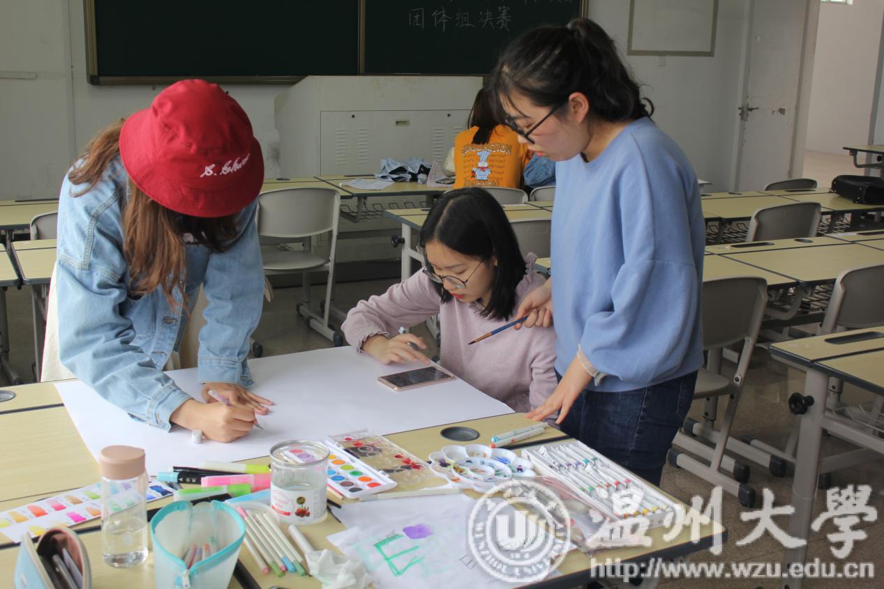比赛伊始,单人赛教室的同学已然端坐在自己的位置上,在书写纸下发后,整个教室唯余笔端游移纸上的声音,每一个人都全神贯注,以发挥自己最好的水平。一个又一个娟秀精致的字母单词被誊写出来,齐整美观,整个教室溢满了文墨书香。而另一头团体组的同学在知晓此次比赛的主题后,也陷入了紧张的讨论之中,商讨彼此的看法,融合各自的见解,以确定小组的最终主题。与单人组誊写的比赛方式不同,团体组采用书画结合的模式,每一幅作品不仅排列着整齐娟秀的英文句子,还有着别出心裁的图案色彩填充,最终结合成完美的答卷。