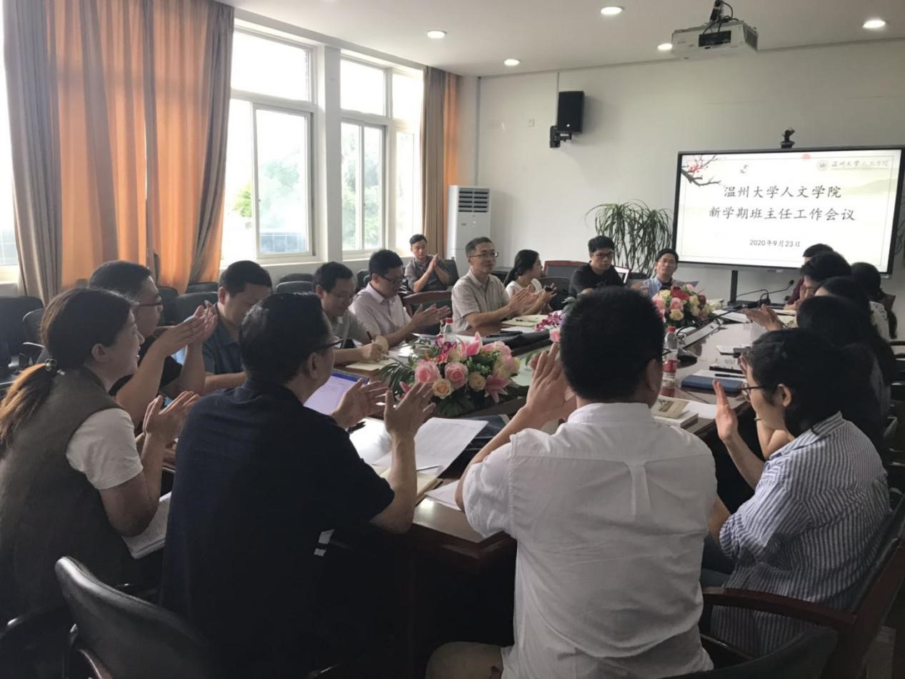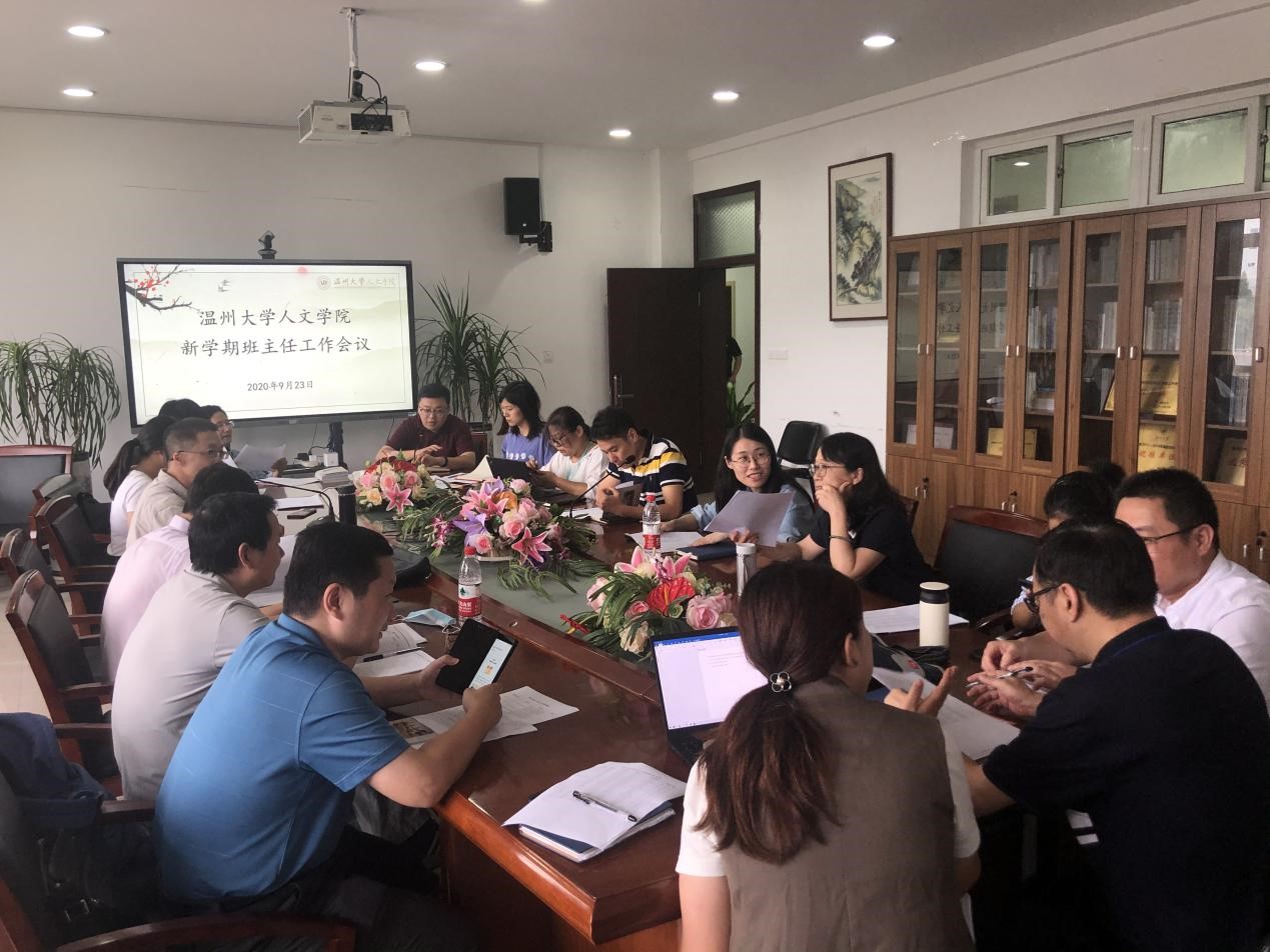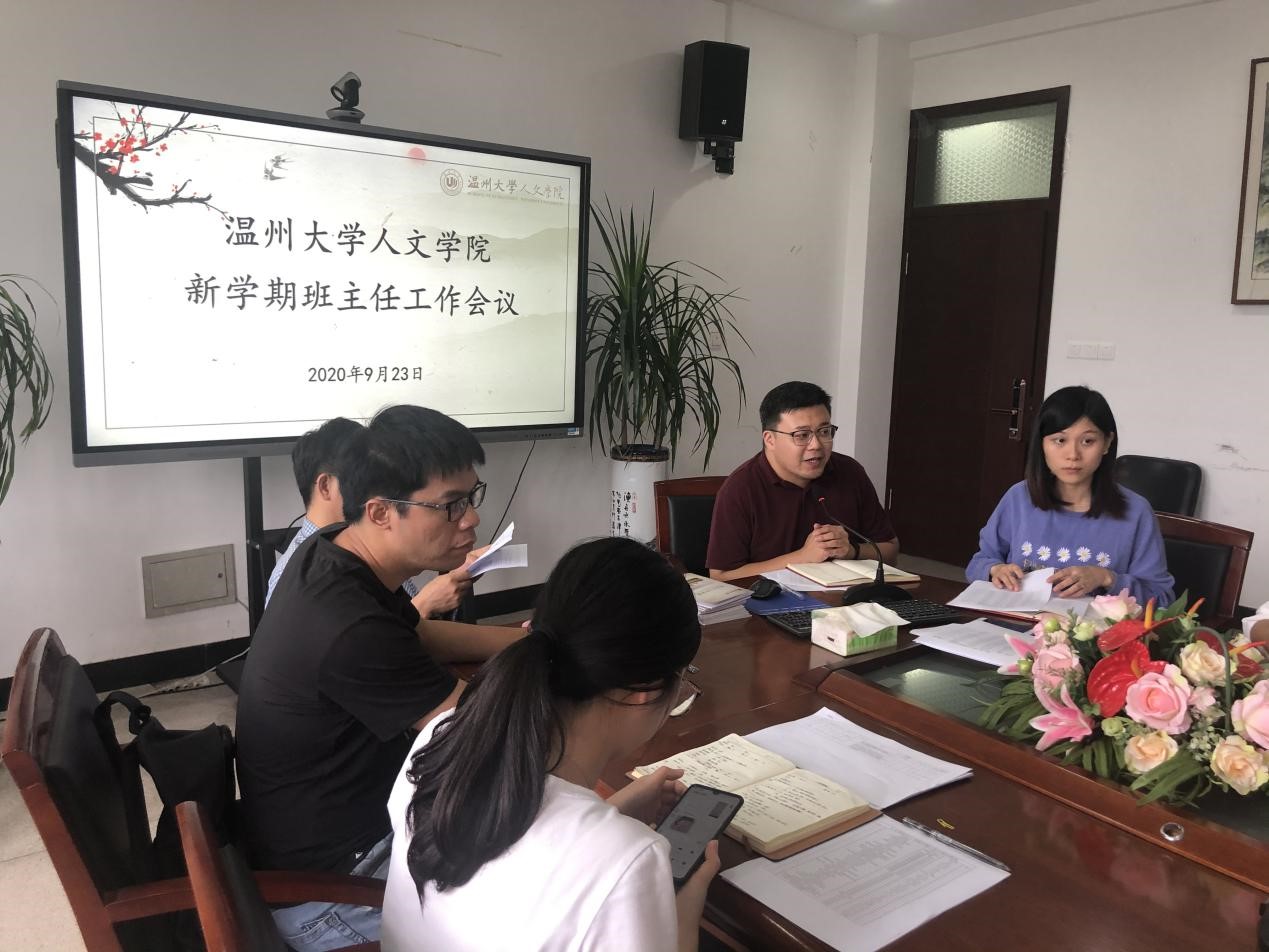 2020年9月23日下午,财神捕鱼 在人文楼213会议室召开了本学期的新学期班主任工作会议。财神捕鱼 党委副书记魏一、学工办辅导员胡震鹏、申业磊、李丹萍、张丹妮及各班级班主任出席此次会议。