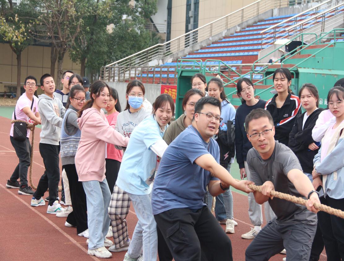 在上午的田径赛事中,100米的短跑运动员们率先上场,在周围同学们的加油声中奋力奔跑,脚下生风,驰骋在这青春的跑道上。紧接着的沙坑跳远、长跑、接力跑等项目更是充满了无限激情与活力。在下午的师生趣味运动项目中,跳长绳、三人四足、往返运球、拔河等项目备受关注,师生同乐,为着同一个目标而不懈奋斗,加油呐喊、欢声笑语荡漾在整片火红的田径场上。
