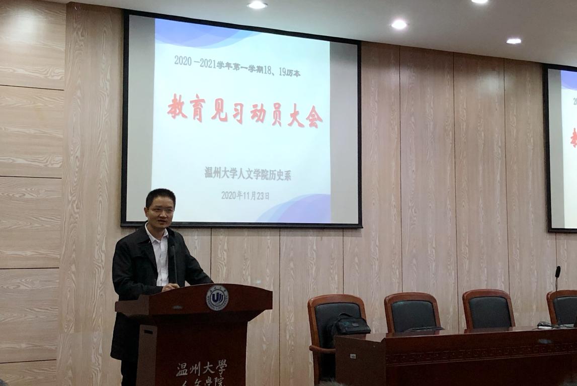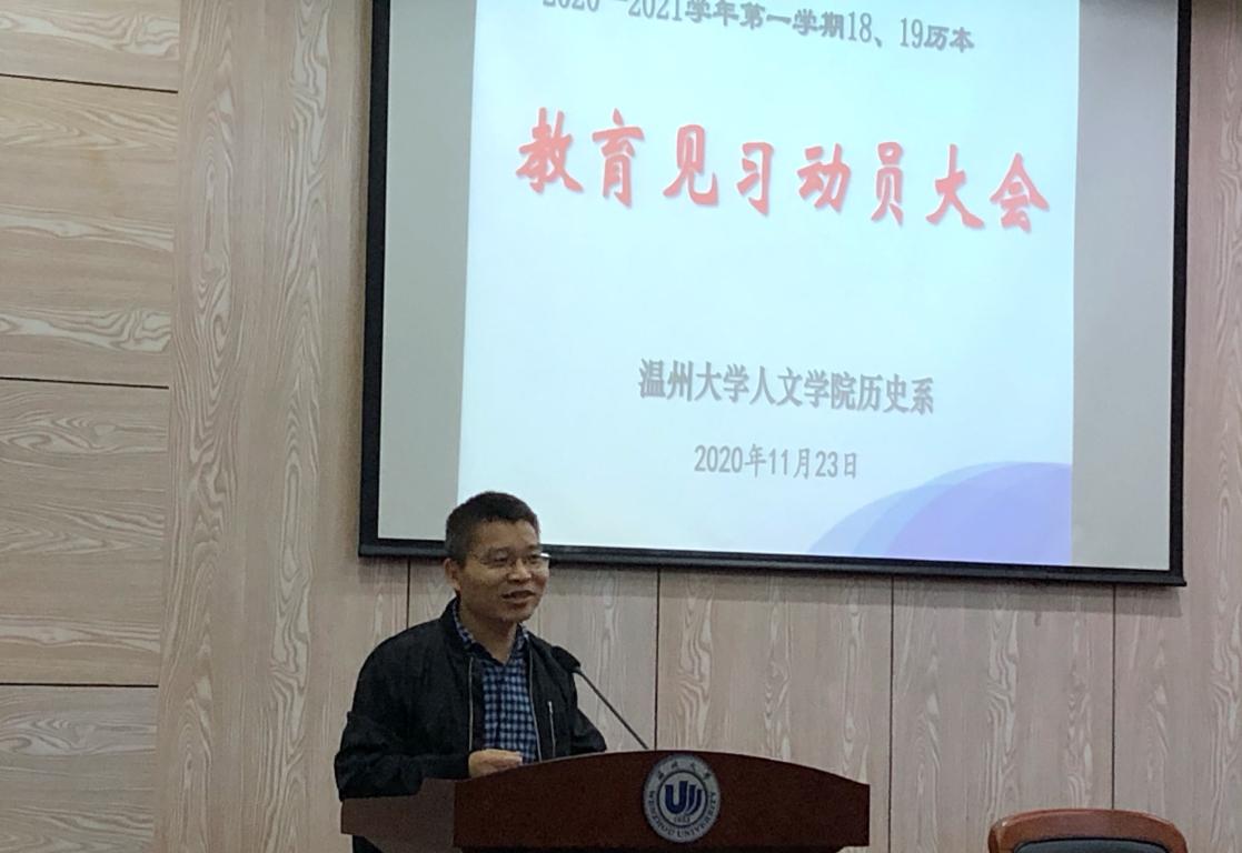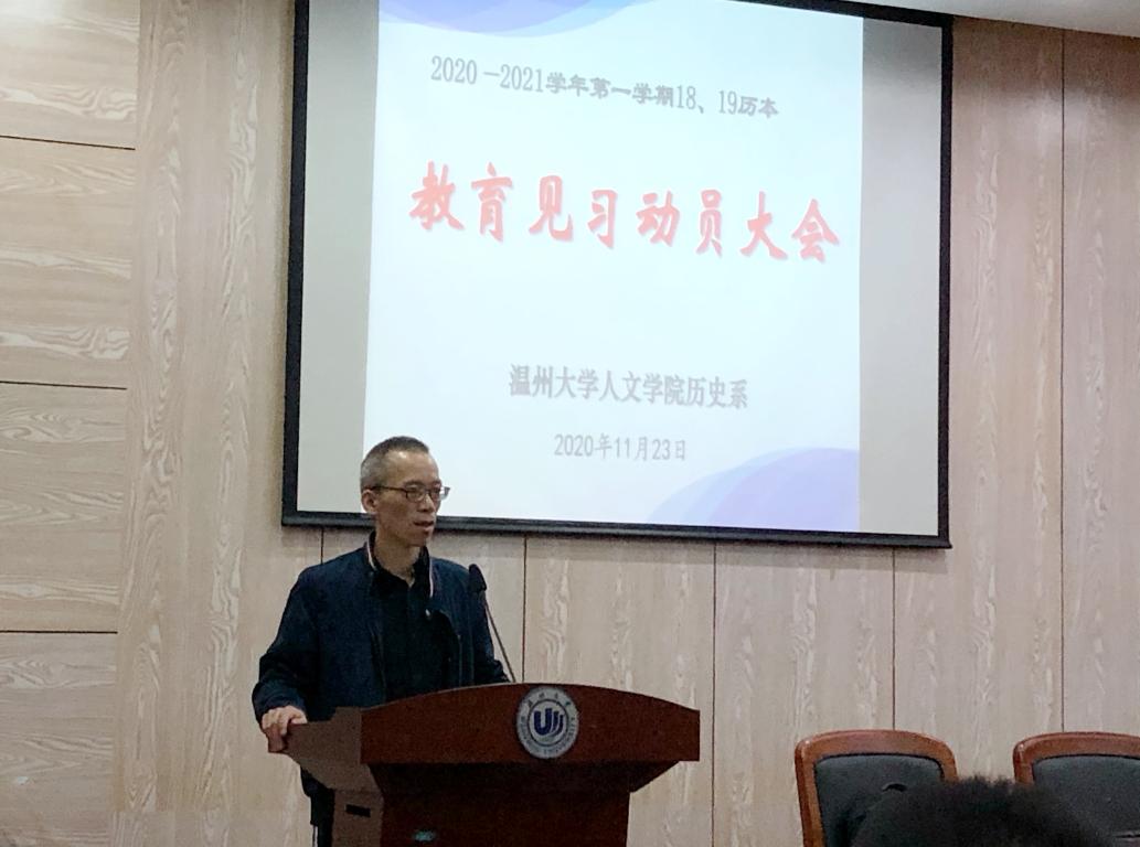 历史系主任尤育号老师随后发言,尤老师谈到历史系的发展计划,“励学敦行”将成为历史系专业办学的特色,师范生的成长涉及相辅相成的两个层面——学与行。历史系的培养方案中有两“行”,一是为学生创造从温州市内到浙江省内外的专业考察机会;二是安排”见习、实习、研习“的三习训练,通过建设完善的实践体系助力师范生的成长。对于同学们即将开始的教育见习安排,尤老师提醒同学们重点做好“看”、“记”、“想”三个方面的要求,希望同学们在见习期间学有所获,认真观察教育教学的全过程,再加以详细的记录,并对教育管理和教学问题进行思考。