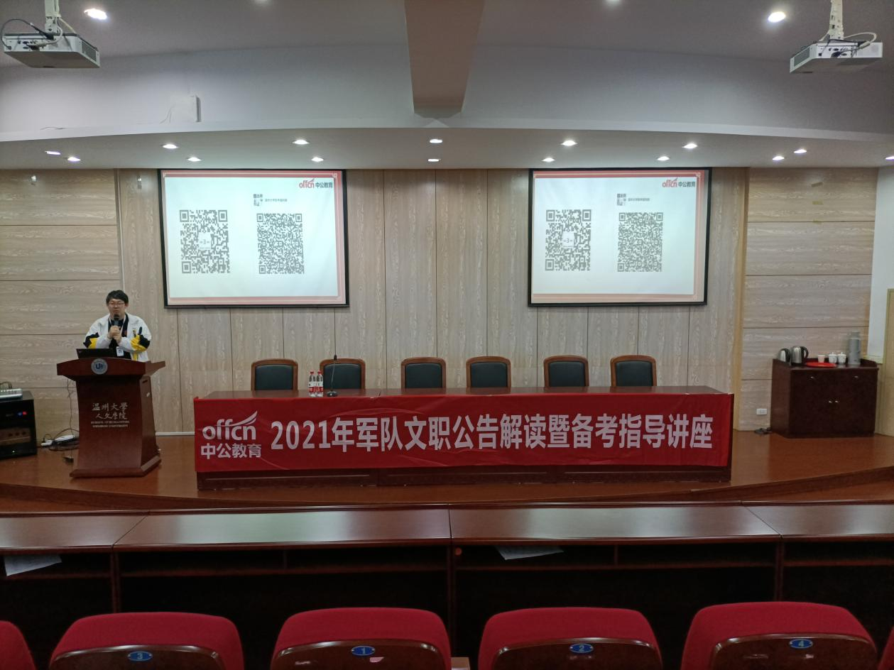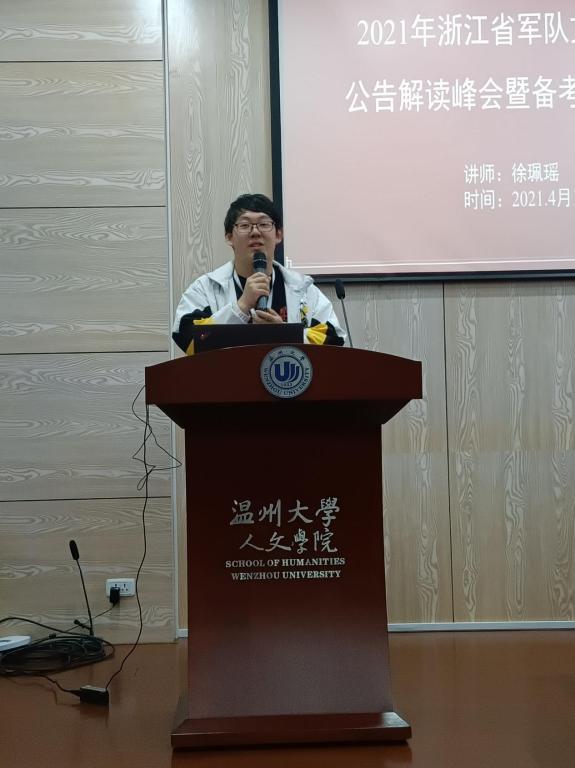 2021年4月10日19点30分,浙江省军队文职考试成绩公告解读峰会暨备考指导讲座在财神捕鱼 人文楼203报告厅如期举行。本次主讲人徐佩瑶老师,从走进文职、招考政策、报考指导、备考指导四个方面深入介绍了军队文职岗位的相关信息,让同学们对其有了一定的了解和认识。