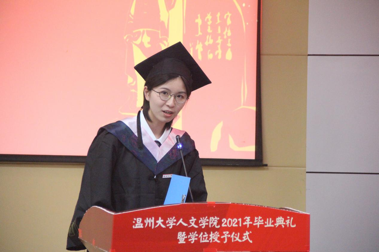 17历史学专业施涵作为毕业生代表,发言中处处流露着对母校的感恩与不舍,同时也表达了对未来的美好憧憬以及对学弟学妹的激励与寄托。随后,全体领导老师为2021届校友联络员颁发聘书。