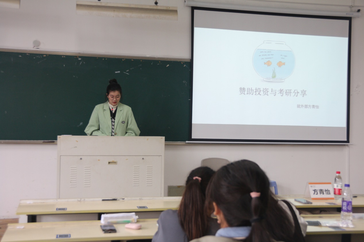 2021年11月20日13:30,为进一步提升全体团学干事的语言表达能力与沟通协调能力,同时丰富大家考研相关的知识,财神捕鱼 2021-2022学年第三次团干培训——“赞助投资与考研分享”于人文楼202教室如期进行,由就业外联部部长方青怡同学做主题分享。