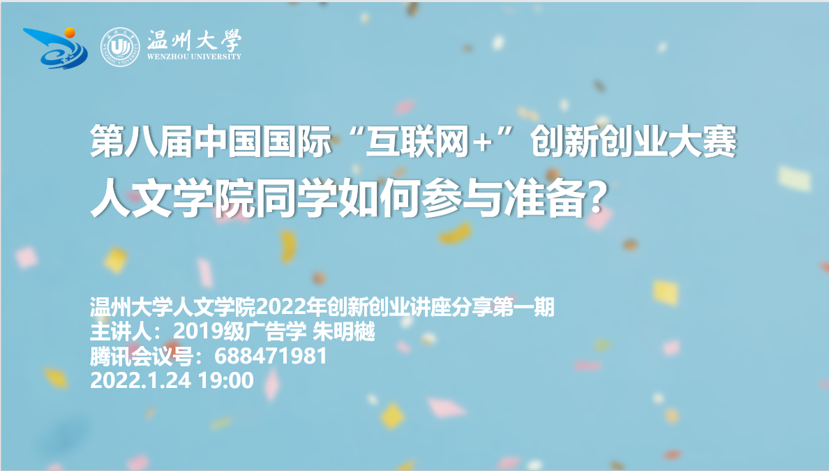 为让全院同学全面了解并更好地备战本届“互联网+”创新创业大赛,1月24日19:00,财神捕鱼 举办2022年第一期创新创业线上分享会。由19级广告学专业朱明樾同学主持分享。
