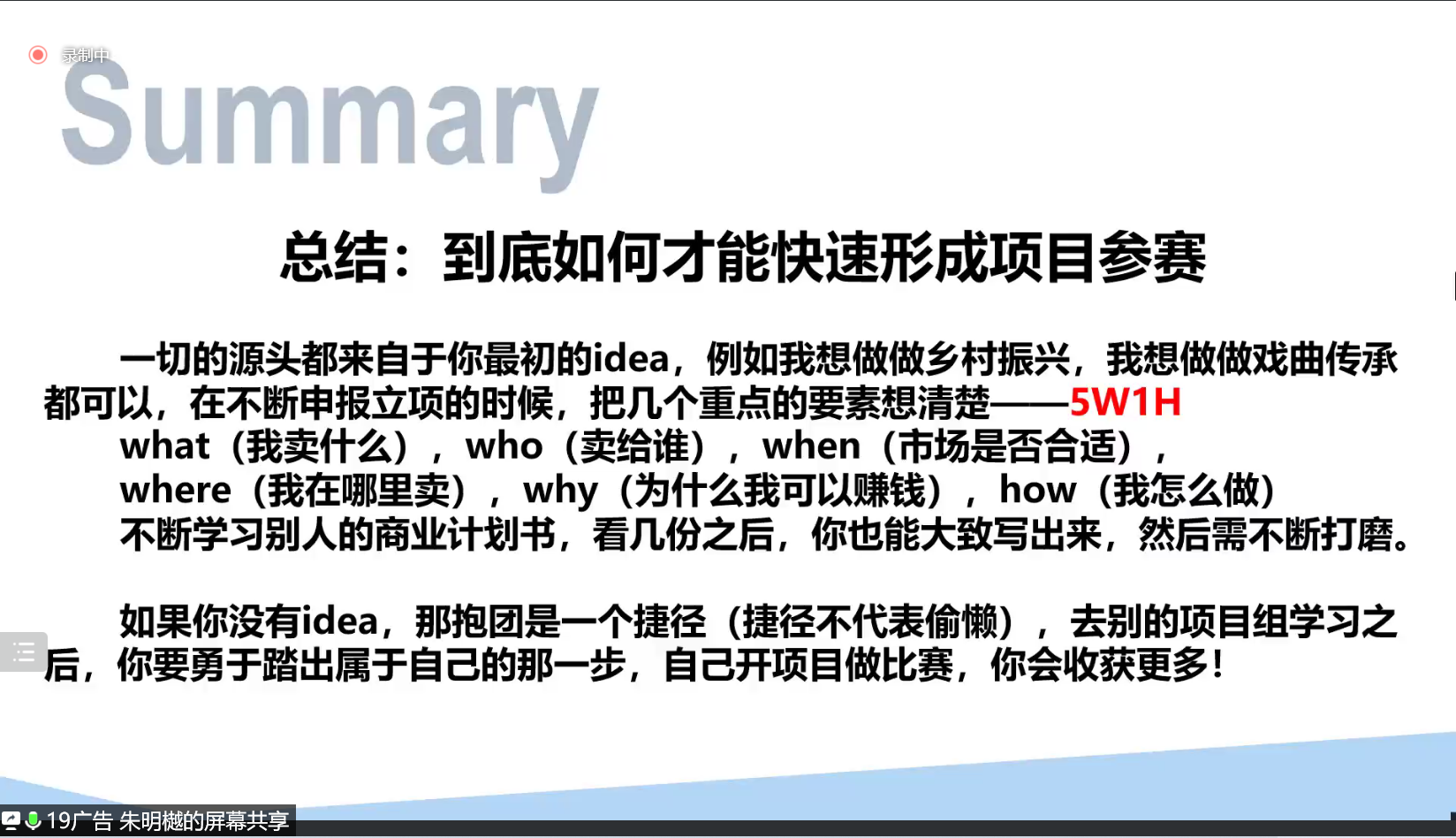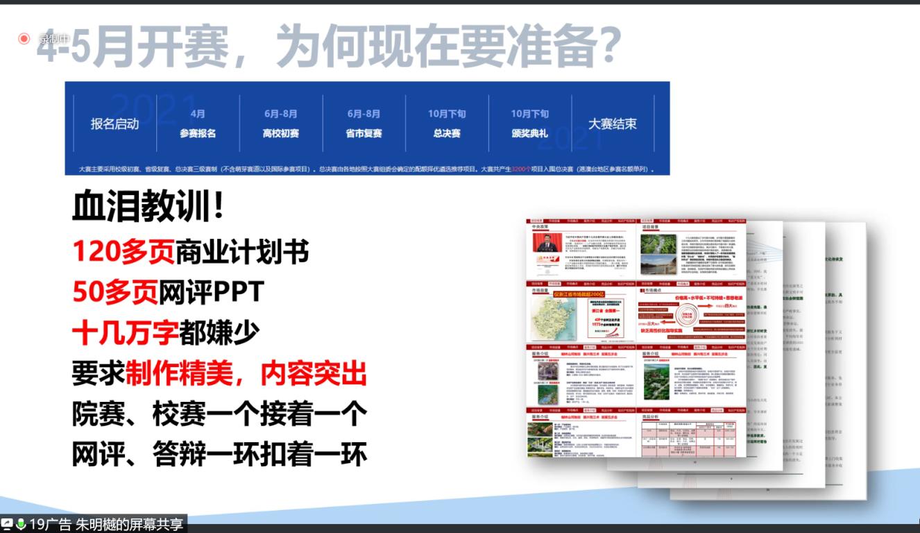 谈到如何准备,朱明樾从组别、内容等角度做了全面剖析,“创新要有创新点,创业要走出创业路”,阐释了商业计划书、路演PPT的含义,并以分析计划书各部分内容、国赛金奖PPT案例为依托,详细地讲述了准备的步骤。此外,他还提出不同组别评审规则存在差别,并就如何组队提出了建议。