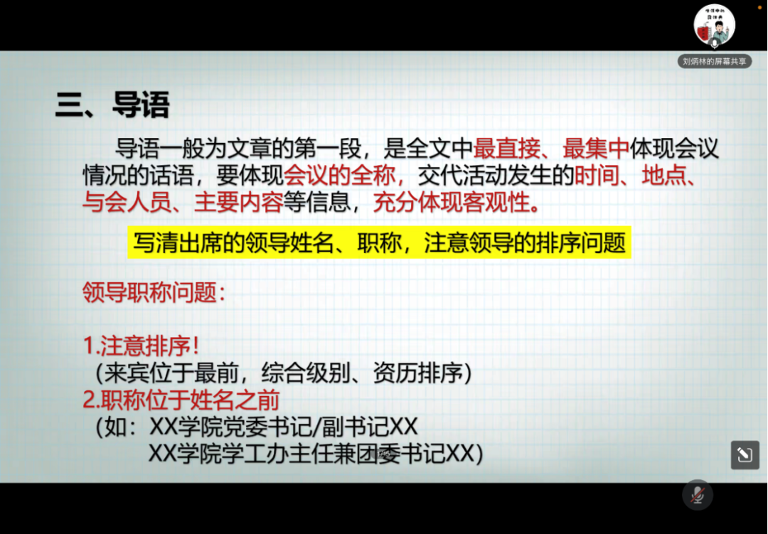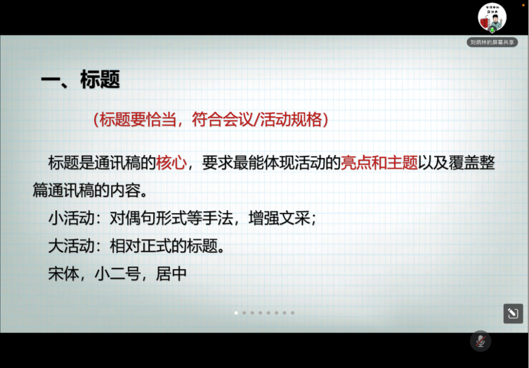 刘炳林老师从标题、副标题、导语三个层面引入,为大家厘清了通讯稿的撰写思路,提供了大致框架。刘老师以各类活动为例,分拆分活动内容、探寻写作角度、切入主题内容三块具体讲述了通讯稿的写作方法,并告诫同学们要“分点提炼,注重层次”。最后,老师对总结语和升华进行了讲解,要求同学们注重层次感,层层递进。同时刘老师还就通讯稿写作的注意点进行提炼,告诫撰写者切记“自我代入”“文风口语化”“错别字,语病”“小题大做,大题小做”,并在讲述过程中举例解释,讲述通俗易懂。