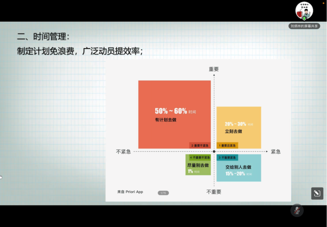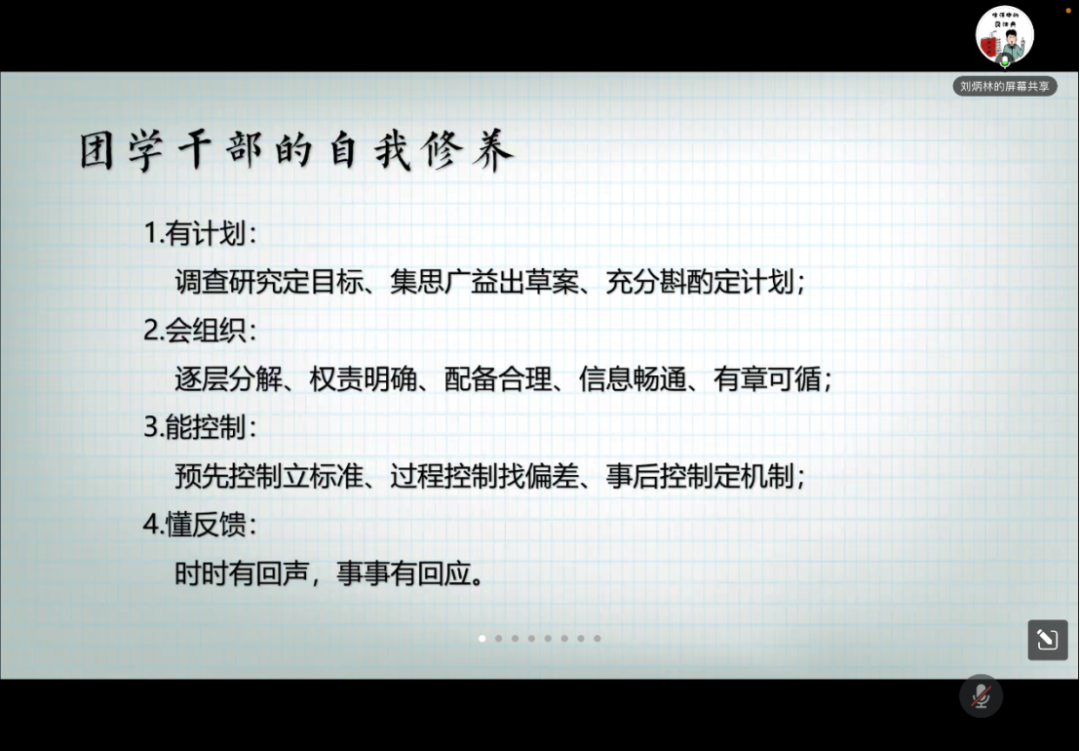 刘炳林老师围绕“团学干部自我修养”展开,提出了实操性强的具体建议,希望同学们落实日常,潜移默化提升自我修养。继而,老师又从“人际协调”“时间管理”“组织开会”三个方面入手,通过划分清晰的要点、展现图表分析两大方式短时快捷地表述信息。