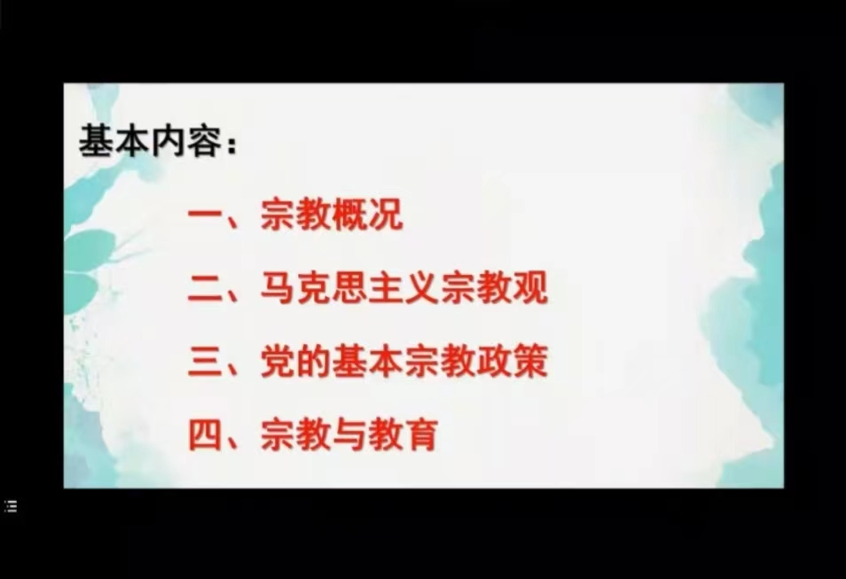 马克思主义财神捕鱼 梁家荣老师从宗教概况、马克思主义宗教观、党的基本政策及宗教与教育四方面展开了详细阐述与分析。他表示,作为新时代的新青年,既已生逢其时,更当肩负起时代赋予我们的重任,主动了解各类宗教背景,掌握相关知识与法规,并树立起积极的世界观、人生观与价值观,以自我实际行动维护党的基本宗教政策。