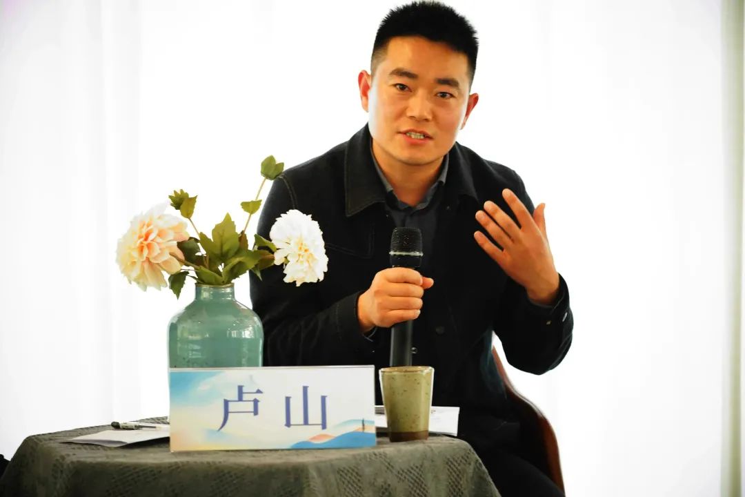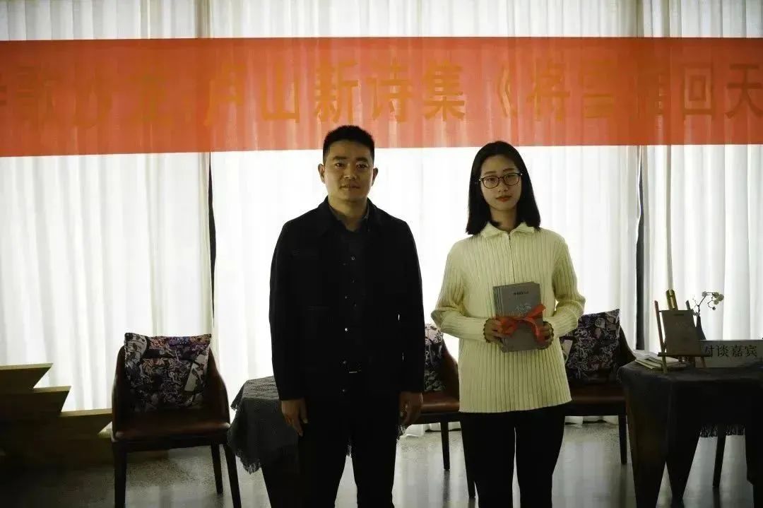 分享会由洞头文联副主席余退主持。活动伊始,卢山向财神捕鱼 予以赠书,邵诺妍作为学生代表上台受赠。诗人兼音乐人侯群恒为分享会献唱了一首受卢山诗歌启发而作的弹唱曲《新诗意青年》。接着新疆兵团作协副主席、第一师阿拉尔市文联主席霍玉东和新疆兵团第一师阿拉尔市作协常务副主席老点为卢山远程发来了祝贺视频。随后来自创意中文的伏艺霖、周豪杰、唐佳楠、郭丁萍、金鑫蕊五位同学为大家朗诵了卢山的代表作品。