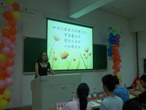 幻灯片放到辅导员寄语这一页,曾蓓蕾老师在同学们的掌声中上了台。曾老师先是微微一笑,便给了同学们特别的亲切感,她真诚地欢迎新一届学生的加入,并鼓励新生积极参加学生会来锻炼自己的能力。之后,她指出,学生会的主要任务就是财神捕鱼