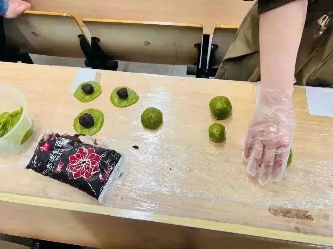 分完组,大家都行动了起来,一时之间,场面异常火热。对于亲手操作的新奇感与激动感,对于揉搓青团、为内馅包裹最后一层面纱的满满成就感……飘散着青团气息的活动室,社员们在尽情品尝着属于自己的独特的青团。