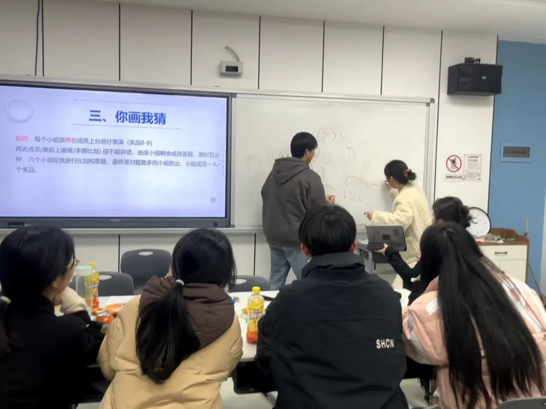 为了让不熟悉的同学们更加亲近,进一步交流,本次培训交流会采取抽签分组的就座方式。除此之外,交流会还特意准备了“找朋友”“听歌识曲”“你画我猜”等互动小游戏。在“听歌识曲”游戏中,部分网络热门歌曲引发了全场同学的大合唱。“你画我猜”环节同样趣味十足,大家积极参与游戏,场上场下欢笑声不断。团建游戏拉近了两院研会成员的距离。