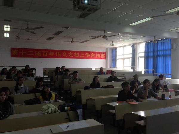 经过主持人的短暂介绍之后,“初上讲台”初赛正式开始。本次比赛所有的参赛者必须在规定时间内完成两个环节,分别为板书书写与教学内容构思演示。第一位上场的选手自信满满地走上讲台,粉笔在她手中翩若游龙,短短几分钟,一首漂亮的七言绝句就展现在黑板上。刚劲有力的粉笔字让在场的同学纷纷发出了赞叹之声。随后,她打开精心制作的PPT课件,向评委老师和全体同学展示她的教学内容。举手投足之间,自信满满,语言充满了激情。她的展示赢得了在场老师和同学的阵阵掌声。第一位选手的成功给了其他选手莫大的鼓舞。随后上场的选手更是妙语连珠,展现了不俗的实力。同时,他们明晰的思路,工整的板书,也令大家佩服不已。在他们的讲演下,一篇篇熟悉的课文变得如此生动形象和引人入胜。在他们身上,我们可以看到一个未来的人民教师正在逐渐成长。比赛在热烈的气氛中逐渐步入了尾声,而同学们意犹未尽,仍在细细回味选手们的风采。