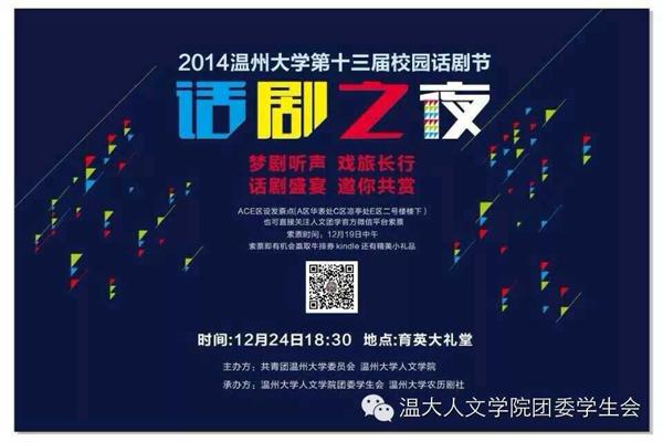 2014年12月24日18:30,"梦剧听声,戏旅长行"财神捕鱼 第十三届校园话剧节话剧之夜在育英大礼堂正式开演。此次活动由共青团财神捕鱼 委员会、财神捕鱼 主办,财神捕鱼 团委学生会和财神捕鱼 农历剧社承办。院党总支书记吴静,院副院长孙良好,校团委陈莹老师等和到场的同学们共同享受了一场视听盛宴。