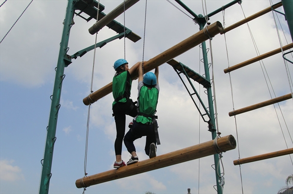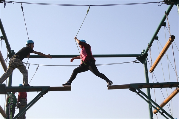 在短暂的分组、热身之后,上午9时许,户外素拓活动正式开始。同学们挑战的首个项目是“跳断桥”。虽然只需跨越一米四左右的距离,但对于处在8米高空上的同学来说,这实是不小的挑战。站在8米的高空俯视,不少同学表示心跳骤增,双腿瘫软,惶悚殊甚。“我当时害怕极了,但当我听到底下伙伴们的加油声,看到对面教练宽阔的大手,我顿时心安了不少,而我只管咬咬牙,两眼一闭,跳过去就好。”一位同学如此分享道,“这个项目让我明白,有时候,我们需要一个人前行,这需要一份勇气,但是请记住,这绝不是单枪匹马,你不是一个人在战斗。”这是今天活动的第一课。