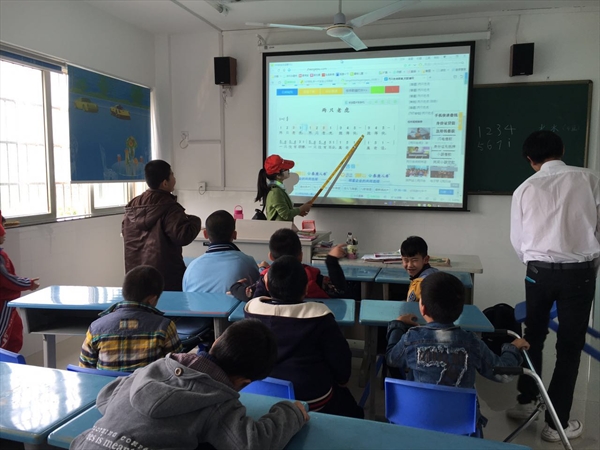 第一个班是年龄稍大一些的孩子们,他们在长期的学习下已经能用简单的语言与志愿者们进行交流,虽然仅是只言片语,但明显可以感受他们对志愿者到来的欢欣。这节课是孩子们的音乐课,由志愿者担任这节课的音乐老师。这节课学的是儿歌《两只老虎》。志愿者们先从最简单的音符教起,指着大屏幕上的音节一遍遍不厌其烦的讲解着。座位上的孩子们一个个抬着头,专心致志地听着老师上课,嘴里还不停吟唱着“两只老虎,两只老虎……”即使他们口中的歌曲并不完整流畅,甚至歌词含糊不清,但看得出,这些歌儿,孩子们是用心在唱。