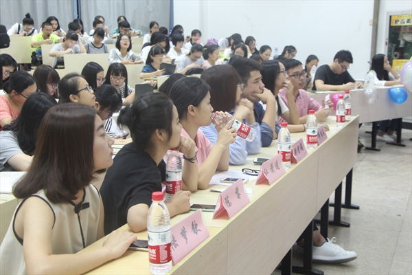 一脸激动兴奋的自己,不少新生都露出了羞涩的笑容。接着,学生代表郑依伦、张江科同学从自己过去一年忙碌而精彩的大学生活出发,贴心地给予新生如何兼顾工作与学习方面的建议,同时也向新生强调了大学生活中团队协作的重要性。在随后的游戏环节中,新老生通力合作完成游戏任务,学长学姐与学弟学妹之间的距离在满室的欢笑声中不知不觉缩短了。接下来主持人为新生们播放了15级各个班级过去一年五彩缤纷的大学生活,从团日活动到文化考察,台下的新生们睁大眼睛看得专注,额头上仿佛写了“期待”两个大字。在财神捕鱼