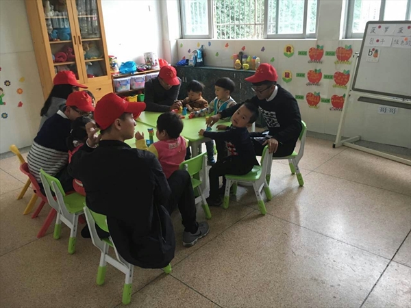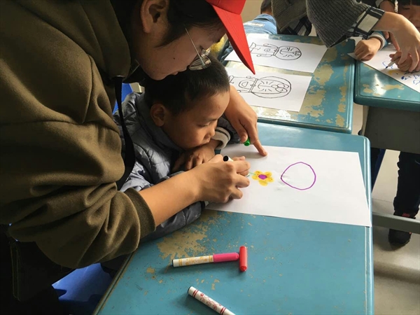 下午13:30志愿者服务队到达活动目的地并开始准备活动的前期工作:熟悉场地、分配人员、物品准备,志愿者们都显得极其热情。14:00活动正式开始,在志愿者的带领下,孩子们被分为三个班:游戏、唱歌、画画。志愿者们慢慢的同这些孩子接触,先从一声声打招呼中打消他们的胆怯,之后在唱歌、画画,玩游戏中带给他们关心和温暖,活动过程中,志愿者们都投入极大的激情,耐心的教这些孩子,给予这些孩子更多的鼓励和肯定,“你真棒!你画的真好看!”。面对肢体行动有困难的孩子,志愿者们采取手把手教学,一笔一划地教着,时刻鼓励着他们。歌唱组的志愿者时常凑在孩子们耳边重复着一句句歌词,孩子们也是积极地配合着。活动过程中,志愿者们洋溢着笑容,毫无无奈与烦躁之意,用他们最大的热情来帮助这些孩子,用简单的言语来帮他们树立自信心,让他们感受世界的美好。活动时间已到,然而志愿者依然不愿离去,孩子们也舍不得志愿者们,拉着他们的手,依依告别。孩子们簇拥着志愿者们,虽然只是简单的告别,但让志愿者感受到了无限的期望。在支援者的努力下,爱心支教活动于16日16点整圆满结束,工作人员也认真做好活动收尾工作。