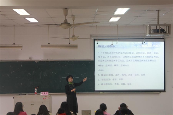 讲座一开场,盛老师表示,希望到场同学能够通过本次讲座喜欢上地名文化,并积极参与她有关地名研究的课题。然后开始讲座正式内容。盛老师先为大家简单介绍了全国方言分类,尤其细讲了吴语的分布情况和分类方法。之后,她介绍了地名的民族性、地域性、稳固性、时代性等特点。大家对方言和地名分别有了初步了解后,她便重点讲解了方言和地名之间的关系。方言在一定程度上制约着地名,地名又在很多情况下反映了方言。盛老师讲到,方言与地名的承续具有重大的文化意义,比如方言中保留了古音、地名反映古音演变的规律、地名与方言保存了古义等。最后,盛老师还介绍了温州方言和地名的一些独有的特点。