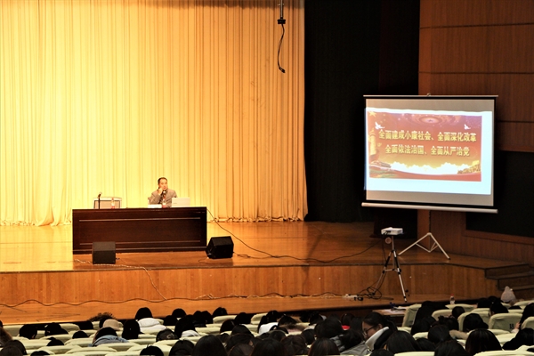 杨老师围绕党的十八届六中全会进行了解读。他介绍到,十八大是对全面建成小康社会、全面深化改革、全面依法治国、全面从严治党这“四个全面”的战略布局部署的总结。我们党是拥有领导力的执政党,如何建设好党是一个至关重要的问题。他提到,要想办好中国的事情,关键在党,关键在党要管党,从严治党。而以习近平同志为核心的党中央,身体力行、率先垂范,坚持思想建党和制度建党紧密结合。自改革开放以来,中国的变化翻天覆地,其关键就在于我们坚持了正确的思想制度建设。杨老师话锋一转,又讲到在向好的发展势头中也有着“四大考验、四大危险”需要克服和面对。他还简单介绍了十八大的一些看点和核心精神,以及主要成果。他恳切地说到,党和国家大事离我们并不远,大学生要懂得国家大事、国际大事与个人形势,努力学习理论知识及党和国家的政策,提高认识,找到自己发展的机会和理想的位置。