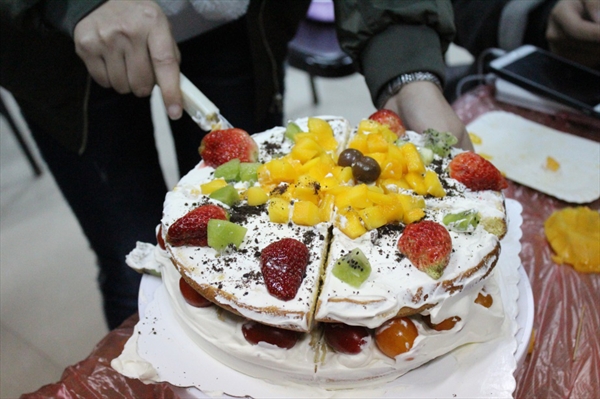 然后便是抹奶油和撒水果。每个组都派出一人从烘培老师处拿来已经调制好的奶油,接着两三人协作给蛋糕一层层地刷上奶油。等蛋糕坯表面完全被香滑的奶油覆盖,就可以着手将事先切好的各种水果镶嵌到蛋糕上。同学们都很有艺术细胞,将不同颜色的水果颗粒精心搭配起来,有的还别出新意地摆出各种形状。慢慢地,一个个精美的蛋糕在大家的共同努力下逐渐成型。