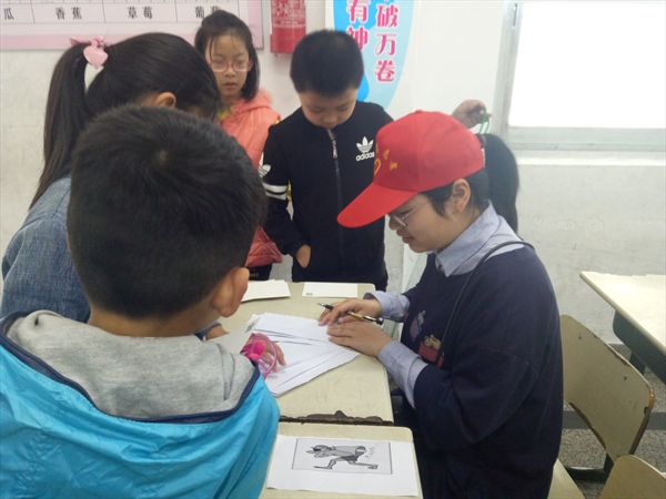 第一个项目是看图猜成语,小孩子们排队进行游戏,与志愿者斗智斗勇。第二个项目是给字组偏旁,这是本次活动中难度较大的智力题,孩子们绞尽脑汁,最终都成功过关。第三个项目是跳绳100个,户外的项目也由此开始。接下来是投篮项目,尽管孩子们投篮基础和动作不尽相同,但最终也都完成了目标。10:00,四个项目完成后,进入中场休息环节。此时,志愿者们和孩子们一起待在教室里画画、下棋,氛围十分融洽。短暂的休息过后,集体项目开始进行。首先是跳垫子,小朋友们组队连续通过五个垫子障碍即完成。之后是接力赛,将小朋友们平均分成两组,志愿者们也按数量组成一组,三支队伍进行比赛,刺激而激烈。活动最后是双人夹篮球环节,志愿者和小朋友们一起参与,两两一组完成挑战。紧张刺激的运动会也在最后一组小朋友完成挑战后宣告落幕,孩子们也通过自己的努力参与拼搏获得了志愿者们准备好的小书签和明信片。11:00,活动结束,志愿者们离开丽岙一小。