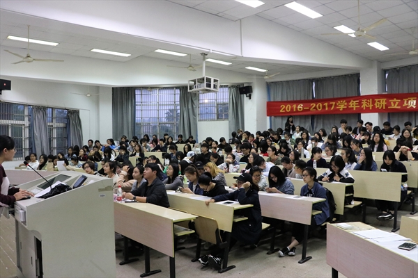 于人文楼101教室举办科研立项动员大会。本次大会邀请了团学主席团以及几位科研立项申报成功的同学出席,大一同学全体参加。