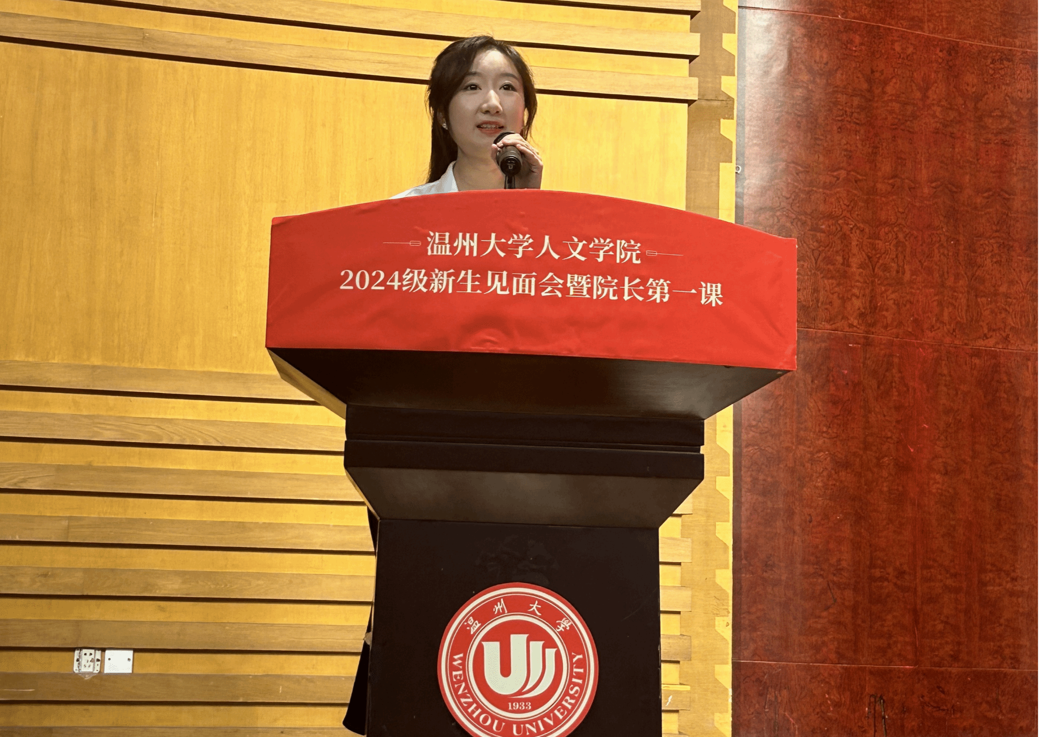教师代表赵天骄老师在发言中指出大学是一个包容、追求全面发展的地方,同学们将会在大学获得自我徜徉的机会。她通过自己不断在大学各种途径追求戏曲学习,最终成为一名戏剧学学者的亲身经历,鼓励每一位新生找到自己向往的发展方向,达到全面发展的目标。随后,她又为同学们追求全面发展指出了努力方向。她提出,全面发展离不开自主学习的能力,要善于整合资源,还要做好职业规划与人生规划,尽早关注招聘信息,提早做好就业准备。更重要的是,在完成课业学习的同时,不要忘记培养自己的社会责任感和家国情怀,不仅要追求个人的卓越,更要将个人的梦想与国家的发展紧密相连。“少年意气慕千秋,拟作人间第一流”,赵天骄老师引古人之言祝愿新生们在大学生活中不负韶华,奋发图强,与新时代同向同行。