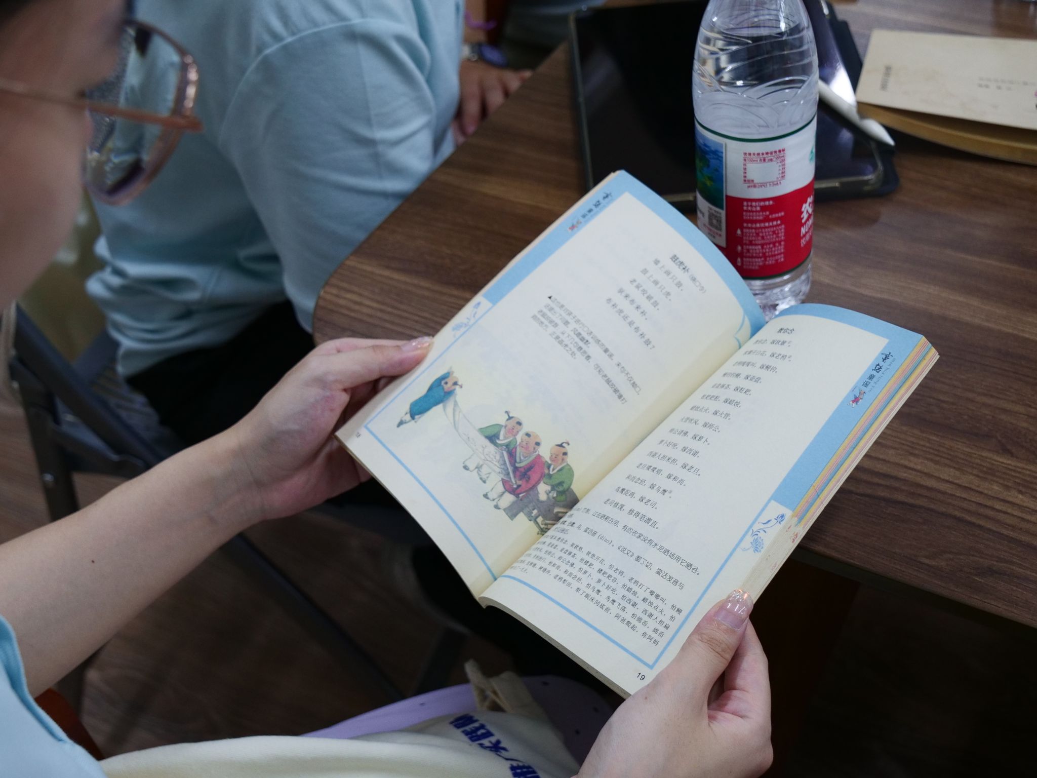 队员们翻阅着《蛮话童谣》,每一首简单、短小的童谣都配有精美的插图,带着泥土的芳香,充满乡土的气息。《蛮话童谣》的成书离不开广大社会热心人士的大力支持与无私奉献,他们通过各种途径积极发挥着作用,为保护苍南蛮话方言贡献力量。